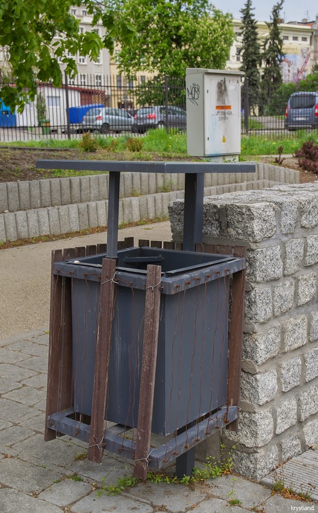 Wiele koszy na śmieci ma powyrywane elementy, ten kosz jest chyba w najgorszym stanie