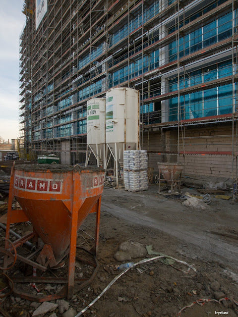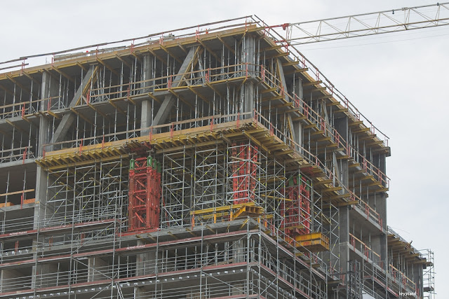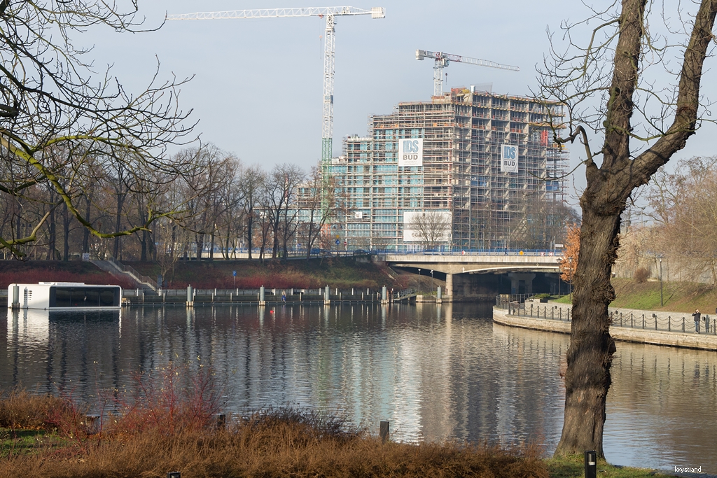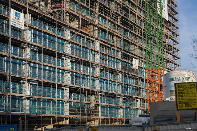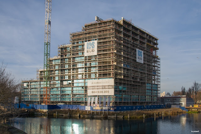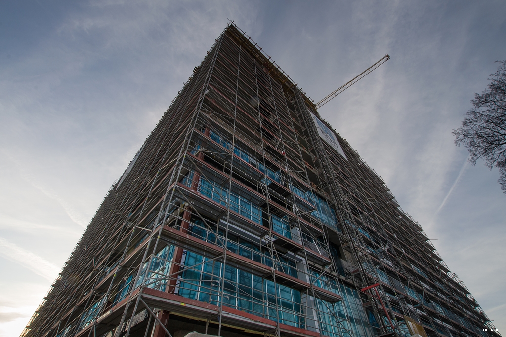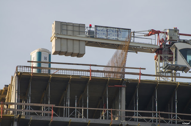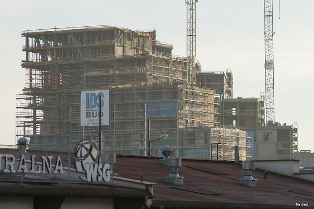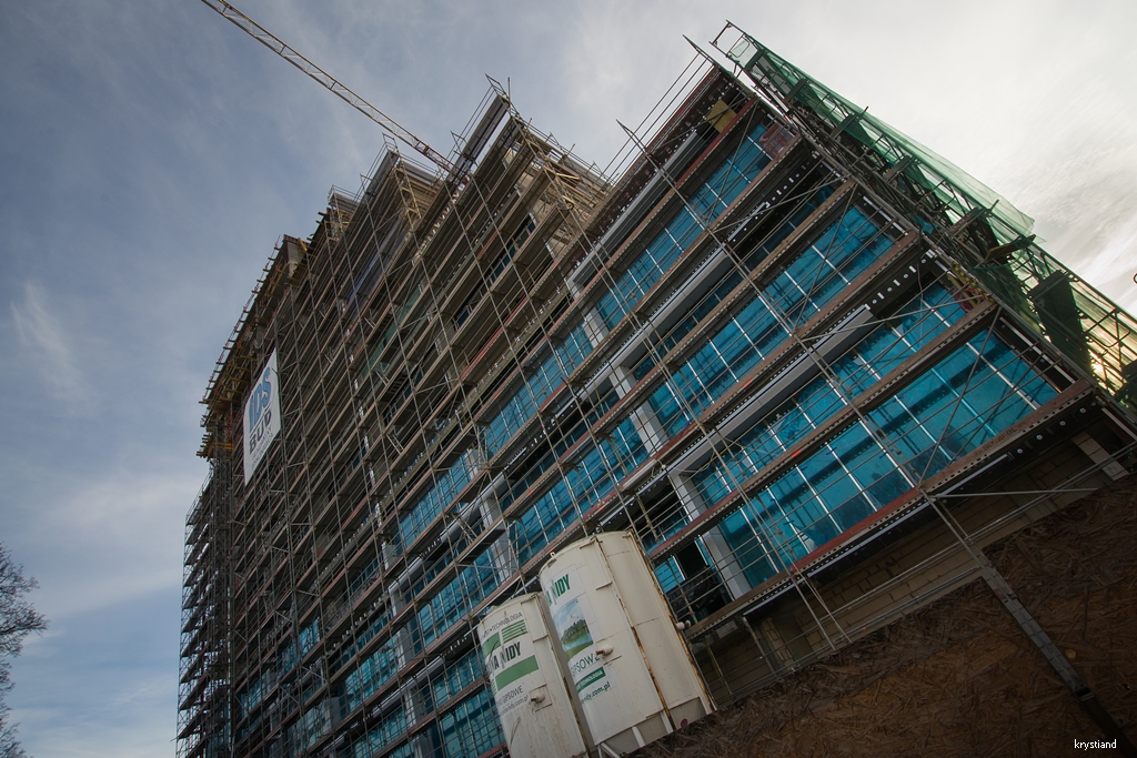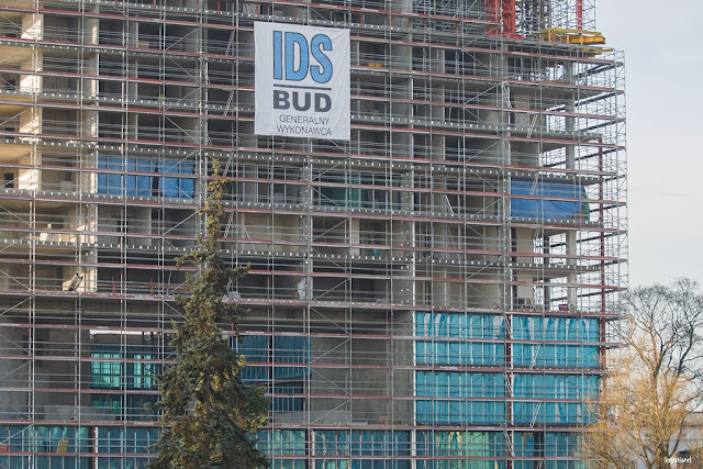 Od poprzedniej relacji z budowy najwyższego budynku mieszkalnego minęło niemal 2 miesiące (24.10.2015). Jest to dosyć długa przerwa jak na tempo prac na budowie. Elewacja jest już nie tylko na części biurowej, sporo szkła widać wyżej. Budynek urośnie jeszcze tylko o dwa piętra, prace przy przedostatnim piętrze już się rozpoczęły. Idealna niedzielna pogoda pozwoliła na sporą ilość zdjęć.