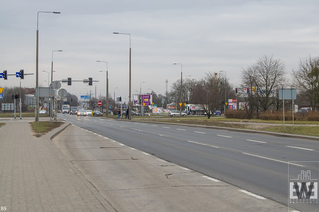 Skrzyżowanie z ulicą Kmicica jest zbudowane niemal docelowo, jedyną zmianą będzie budowa dodatkowych pasów ruchu (na obu jezdniach) umożliwiające skręt w prawo. Widok na zachód.
