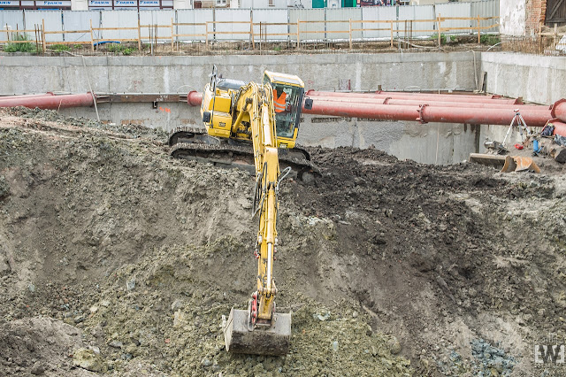 Po wykonaniu ścian szczelinowych można było przystąpić do wydobywania ziemi w miejscu przyszłego biurowca. Dokładne wytłumaczenie na czym polega metoda stosowana na budowie biurowca Immobile K3 możecie zobaczyć na świetnym kanale o architekturze Architecture is a good idea prowadzonego przez warszawskiego architekta: