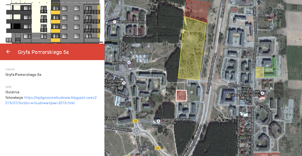 Podobnie jak w przypadku serii „mieszkaniowy plac budowy” pod opisem inwestycji pojawi się wizualizacja (jeśli taka jest dostępna) oraz zrzut z mapy inwestycji.