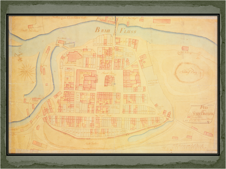 | Plan Bydgoszczy z 1774 roku wykonany przez G.J. Gretha – widoczne pozostałości fos |