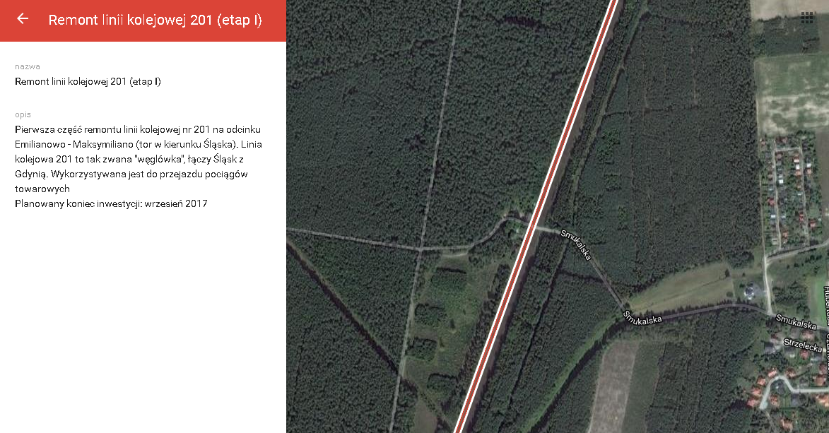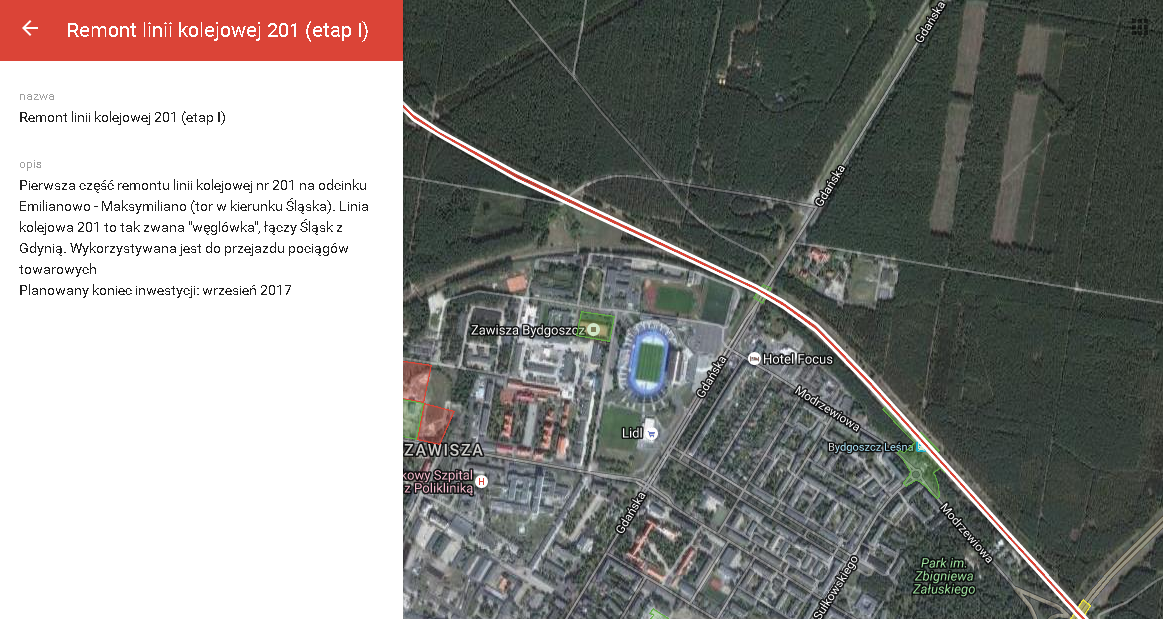 Remont linii 201 został podzielony na dwa etapy. Pierwszy, obecnie trwający, zakłada remont torów na torze prowadzącym w stronę Śląska. Drugi, który rozpocznie się w przyszłym roku, obejmie drugi tor w kierunku Pomorza. Podzielenie projektu na dwa etapy pozwala na kursowanie pociągów towarowych. Pierwszy etap przewiduje remont 28 km torów, 9 przejazdów kolejowo – drogowych, 2 przejść, 4 wiaduktów oraz jednego mostu przez Brdę, koszt inwestycji to 54 mln złotych.