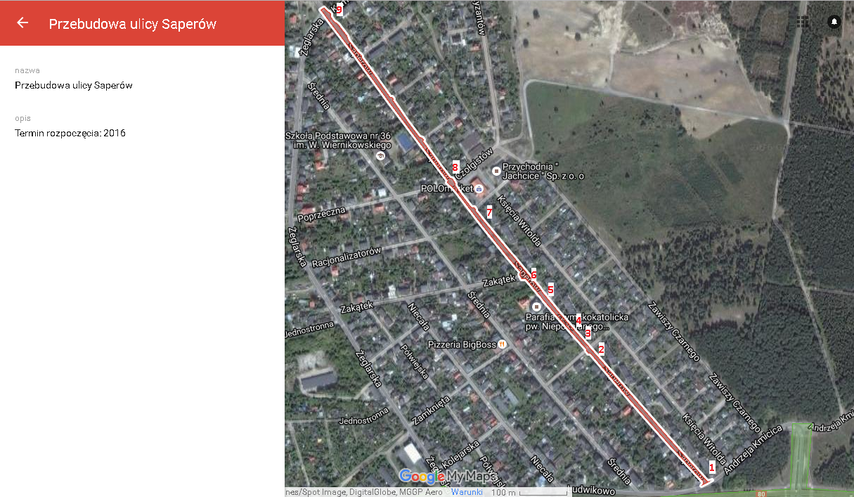 Dla lepszej orientacji gdzie zostało zrobione zdjęcie na zrzucie z mapy inwestycji umieściłem numery, które odpowiadają numerom na zdjęciach. Wyjątkiem jest budowa nowego wiaduktu w ciągu ulicy Wojska Polskiego, ponieważ zdjęcia są robione w zasadzie tylko z dwóch miejsc – po obu stronach Jana Pawła II.