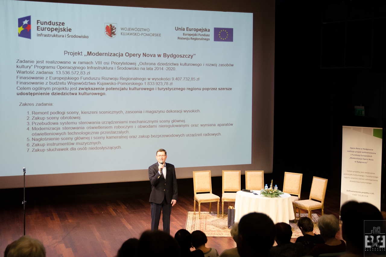 - Opera Nova z dużym dofinansowaniem na remonty i zakup instrumentów – mimo że budowa Opery Nova zakończyła się stosunkowo niedawno (2006 rok) to budynek był wyposażany etapami przez kilkanaście lat. W grudniu władze Opery przedstawiły szczegóły inwestycji na które instytucja otrzymała ponad 9,4 mln złotych dofinansowania z funduszy europejskich, 1,8 mln złotych z budżetu województwa (całkowity koszt inwestycji wyniesie 13,5 mln złotych), brakująca kwota zostanie pokryta z tytułu oszczędności prądu oraz braku konieczności płacenia za wypożyczanie sprzętu. Scena w głównej sali zrobiona została około 1993 roku, przeżyła wiele imprez, spektakli, pożar i prace budowlane, w niektórych miejscach są spore dziury, który zakrywane są drewnianymi płytami (drugie zdjęcie). System zarządzania sceną jest bardzo awaryjny, producent ogłosił upadłość przez co naprawy sprawiają ogromne problemy, oświetlenie nie spełnia dzisiejszych wymagań przez co trzeba wypożyczać nowoczesne urządzenia. Również wiele instrumentów lata świetności ma za sobą, przez co ich strojenie sprawia wiele problemów
