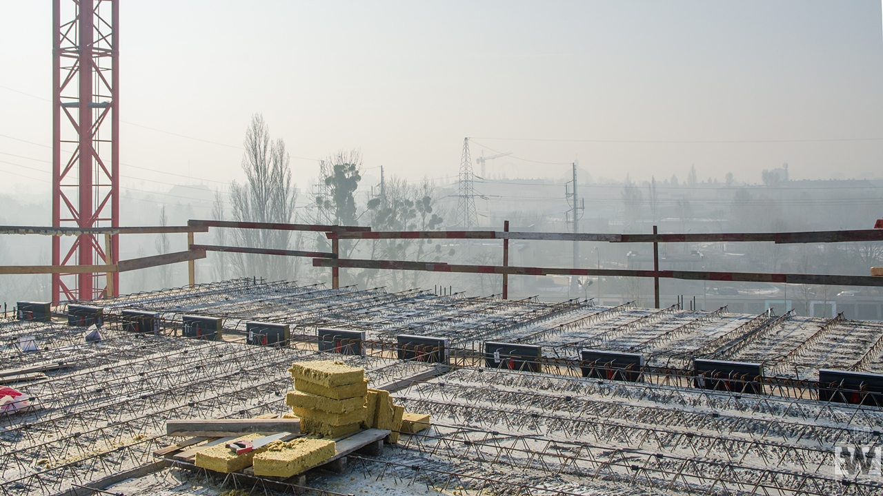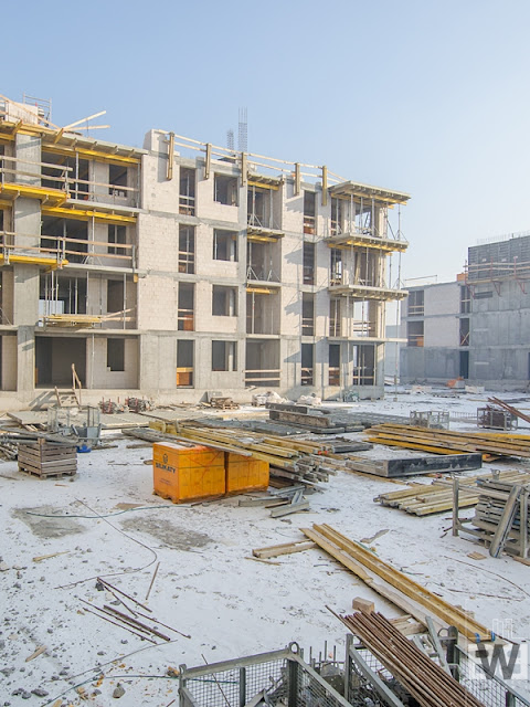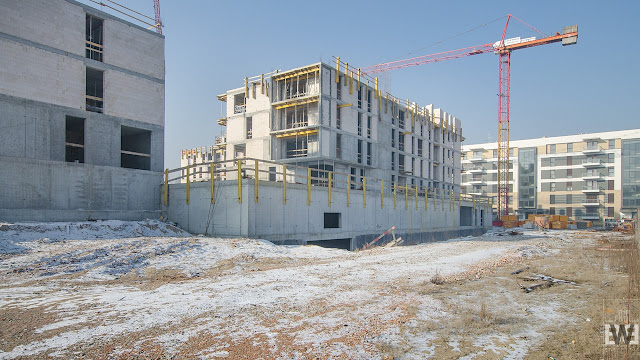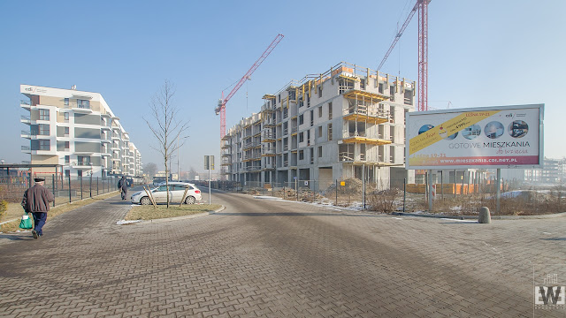 Puste tereny stopniowo są zabudowywane. Pod koniec 2015 roku zakończyła się budowa dwóch pierwszy budynków mieszkalnych (tzw. Etap O, 144 mieszkania), obecnie trwa budowa kolejnych dwóch (Etap I, 148 mieszkań i 1000 m2 powierzchni handlowo-usługowej, zaznaczony czerwonym okręgiem na poniższej wizualizacji), aktualne zaawansowanie prac możecie zobaczyć poniżej.