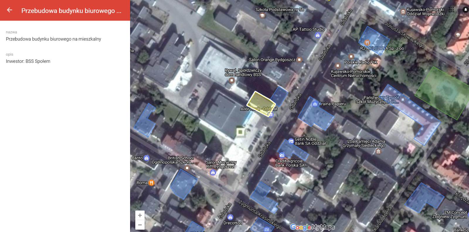 Gdańska 47 (Śródmieście) – wysoki budynek przy ulicy Gdańskiej (przy Rywalu), którego właścicielem jest BSS Społem wkrótce przejdzie remont. Górne kondygnacje mają zostać przebudowane na lokale mieszkalne. Nie są znane szczegóły inwestycji, nie udało mi się znaleźć e-maila do zarządu BSS