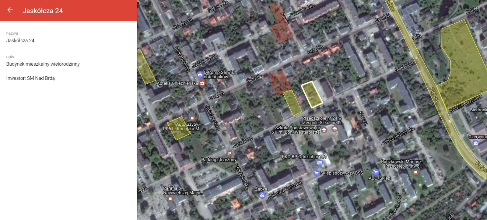 Jaskółcza 24 (Górzyskowo) – nowa inwestycja Spółdzielni Mieszkaniowej Nad Brdą. Inwestor potwierdził informację o inwestycji, jednak obecnie przygotowuje projekt budynku i mieszkań, dlatego żadne inne szczegóły nie są zdradzane. Obecnie w tym miejscu stoi opuszczony niewielki domek, kilkadziesiąt metrów od tego miejsca powstają dwie inne inwestycje Gołębia 33 i Pawia 2, prezentowane wcześniej, a dwie działki na zachód planowana jest inna inwestycja mieszkaniowa