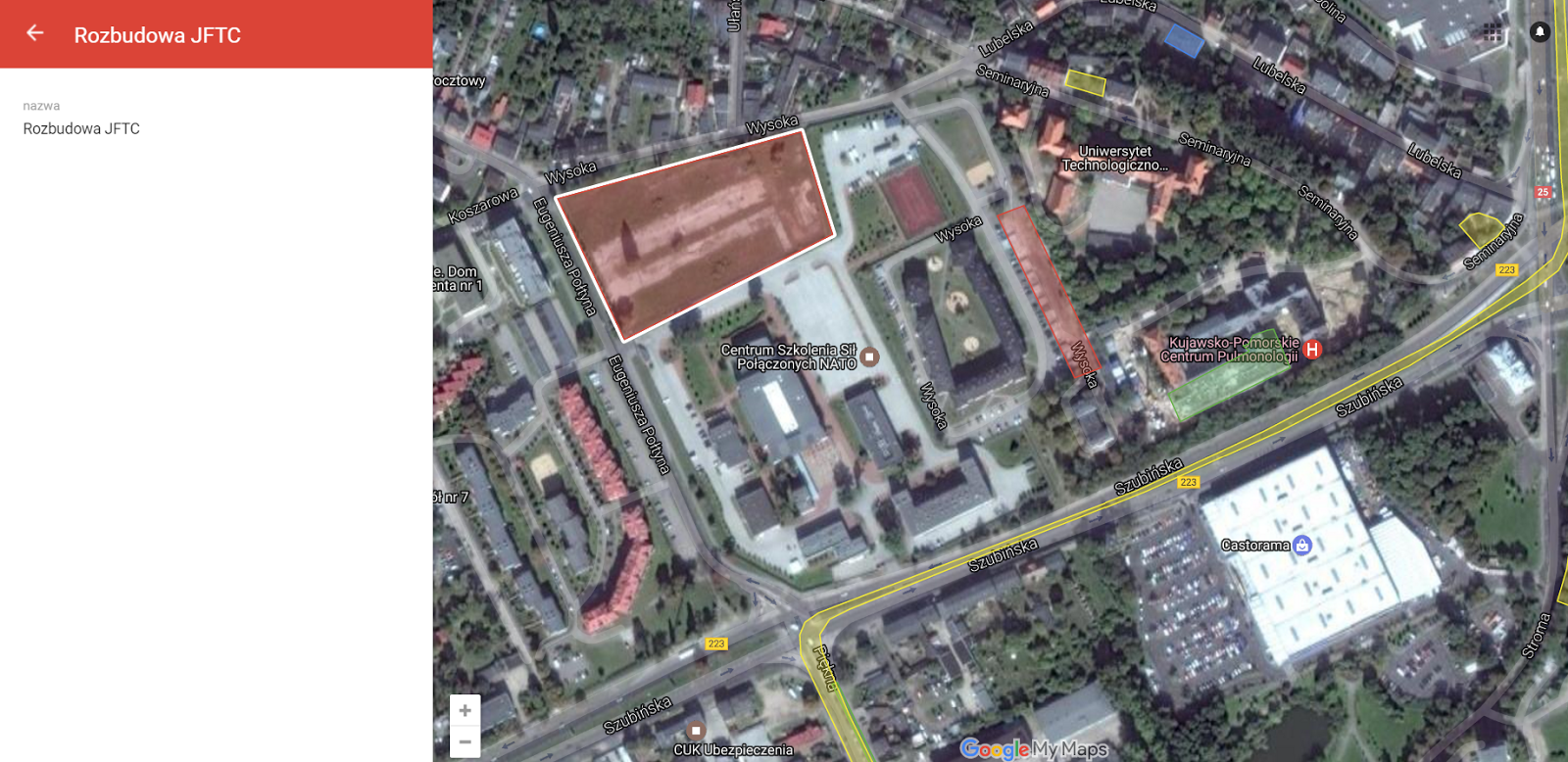 Rozbudowa Joint Force Training Centre przy ulicy Szubińskiej – rozbudowa jednostki natowskiej związana jest z rosnącą liczbą szkoleń. Inwestycja obejmuje przebudowę dwóch istniejących budynków, powstanie nowy budynek garażowo-techniczny oraz zadaszone miejsca parkingowe dla pojazdów ciężarowych. Inwestycja warta jest około 44 miliony złotych, planowany termin zakończenia to połowa 2019 roku