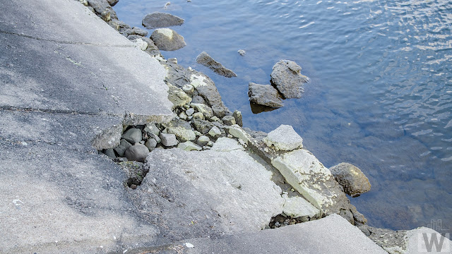| Wyrwy w betonowym nabrzeżu zostały wypełnione kamieniami |