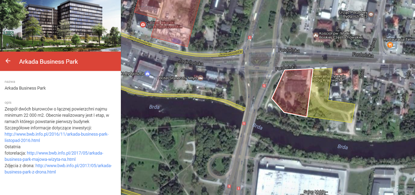 Arkada Business Park – zespół dwóch 12-kondygnacyjnych budynków biurowych powstających w pobliżu ronda Fordońskiego. Obecnie powstaje pierwszy budynek, który będzie miał około 16 000 m2 powierzchni, w tym ponad 800 m2 przeznaczonych pod usługi i niemal 10 000 m2 pod biura. Trwają prace przy szóstym piętrze, zdjęcia ze środka inwestycji pojawiały się na stronie dwukrotnie. Ostatni raz niecały miesiąc temu, trwały wtedy prace przy wznoszeniu czwartego piętra. W pierwszej połowie lipca postaram się kolejny raz odwiedzić budowę