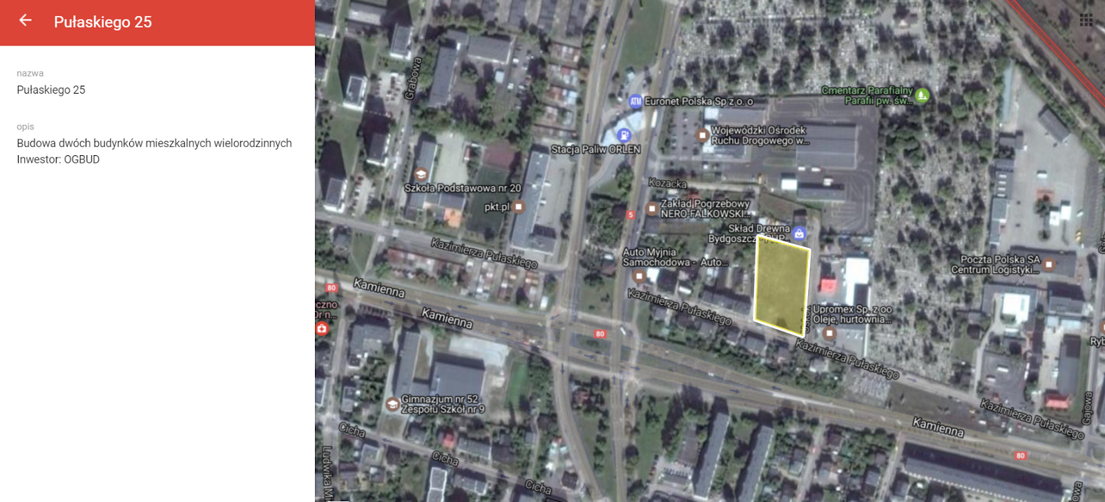 - Nowe mieszkania przy ulicy Pułaskiego – B.P.B.O. Ogbud przygotowuje się do budowy dwóch budynków mieszkalnych wielorodzinnych przy ulicy Pułaskiego 25, na razie nie są znane szczegóły inwestycji
