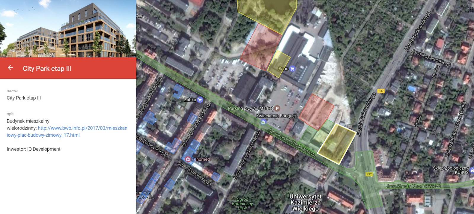 - Kolejny etap budowy mieszkań przy ulicy Chodkiewicza – firma IQ Inwestycje przygotowuje się do budowy trzeciego etapu City Park – kompleksu mieszkalnego w pobliżu Uniwersytetu Kazimierza Wielkiego. W tym celu konieczne jest wyburzenie istniejących budynków, w których znajdują się warsztaty, pijalnia piwa i bar Bosna. W maju wydano pozwolenie na przeprowadzenie tych prac. O inwestycji pisałem w relacji z wiosennych targów mieszkaniowych