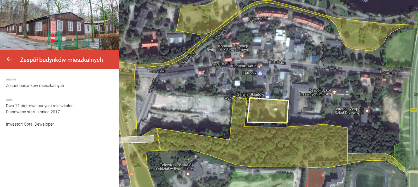 - Rozbiórka przy ulicy Toruńskiej – firma Optal Developer przygotowuje się do budowy dwóch 12-piętrowych budynków mieszkalnych przy ulicy Toruńskiej 30. W tym celu konieczna jest rozbiórka siedziby zarządu rejonowego Ligi Obrony Kraju oraz Koła Strzeleckiego, Sportów Proobronnych i Obrony Terytorialnej LOK „Pogranicznik”. W maju wydano pozwolenie na rozbiórkę, budowa budynków w których znajdzie się łącznie 216 mieszkań powinna ruszyć pod koniec tego roku. O inwestycji wspominałem w relacji z wiosennych targów mieszkaniowych