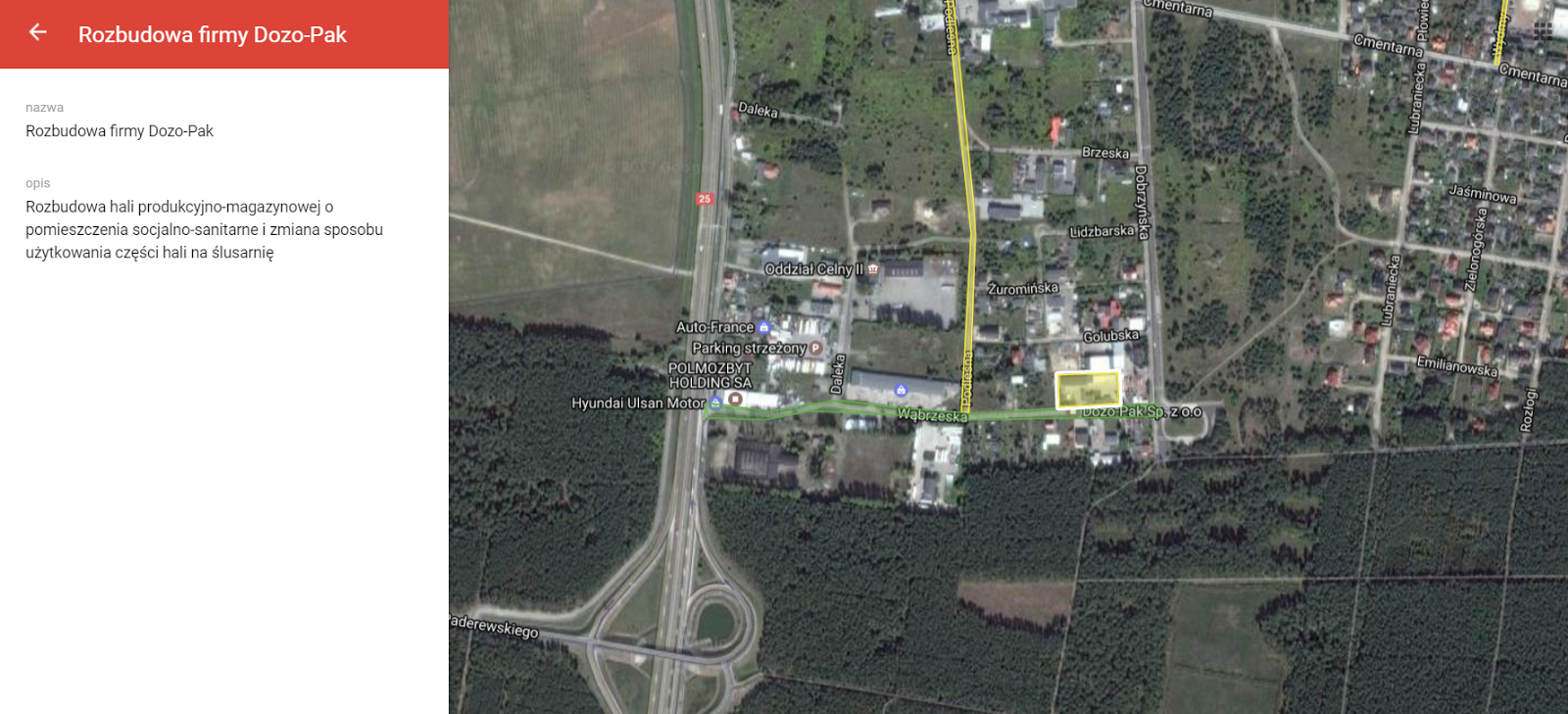- Rozbudowa firmy Dozo-Pak – firma mieszcząca się przy ulicy Wąbrzeskiej 45 przygotowuje się do rozbudowy hali produkcyjno-magazynowej o pomieszczenia socjalno-sanitarne i zmiany sposobu użytkowania części hali na ślusarnię. Firma zajmuje się produkcją, remontami i usługami serwisowymi maszyn przemysłu spożywczego