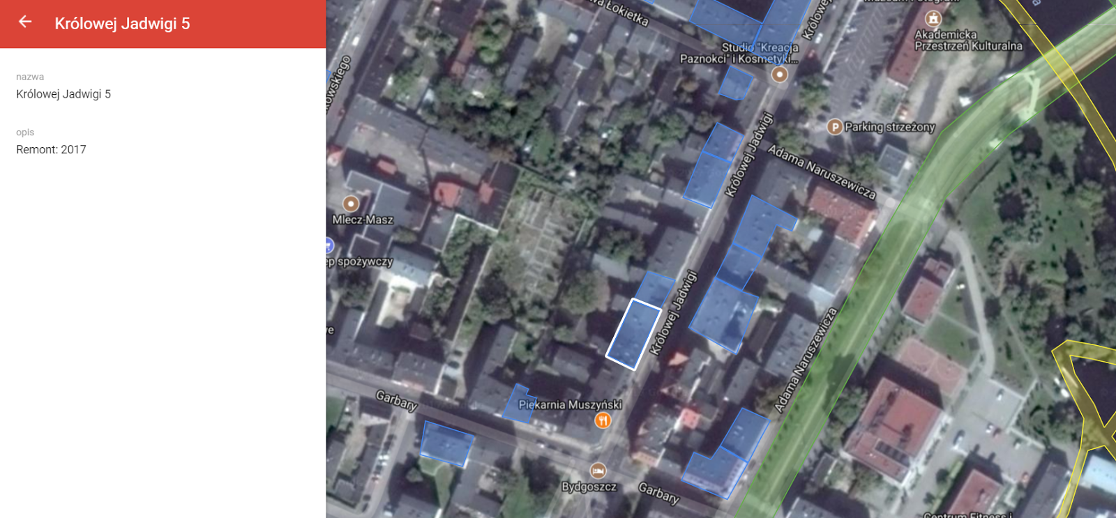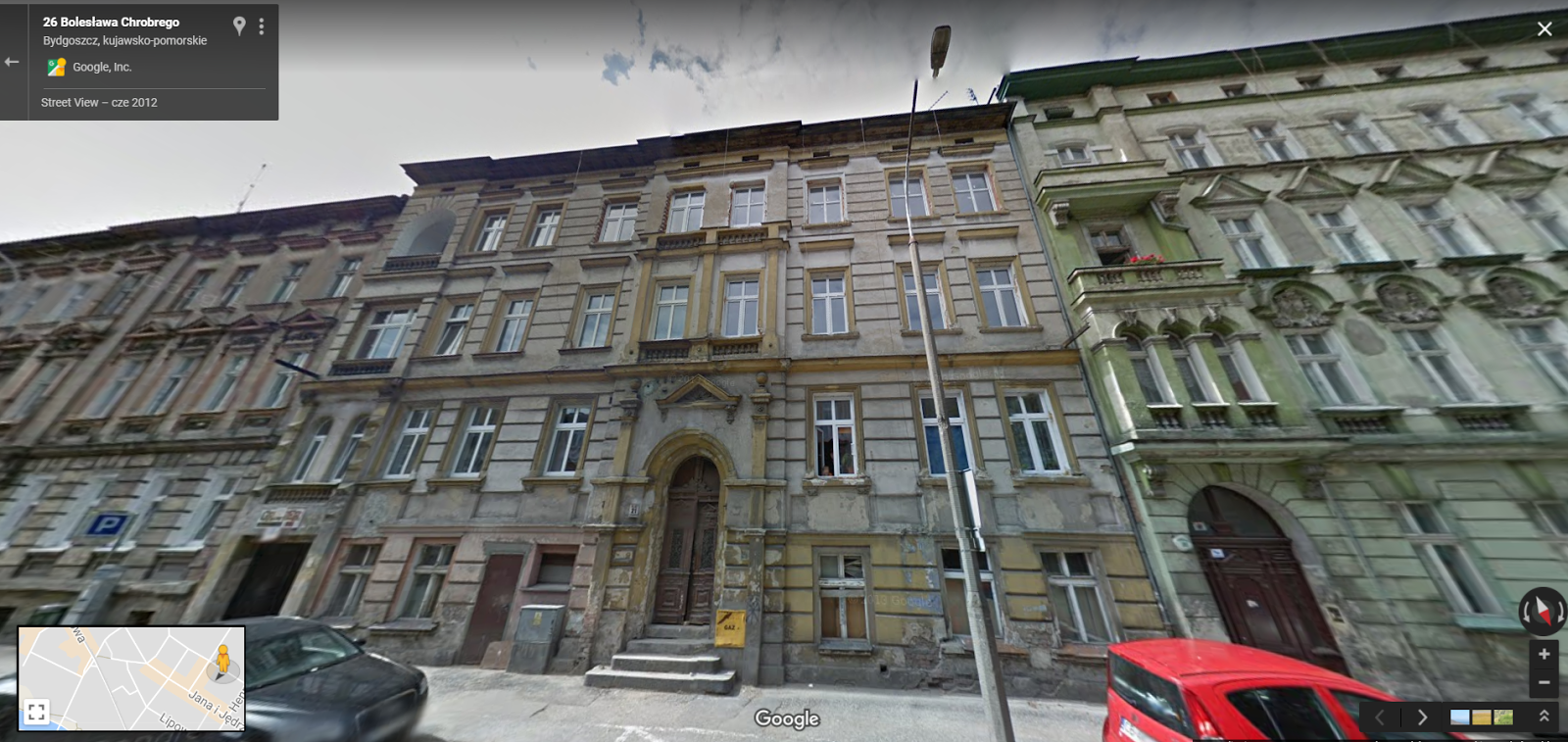 Zdjęcia w galerii przedstawiają w kolejności – adres i lokalizację kamienicy oznaczonej na mapie inwestycji, zdjęcie przed autorstwa Bydgoszcz w budowie lub Google Street Views oraz zdjęcia remontowanej/wyremontowanej kamienicy.