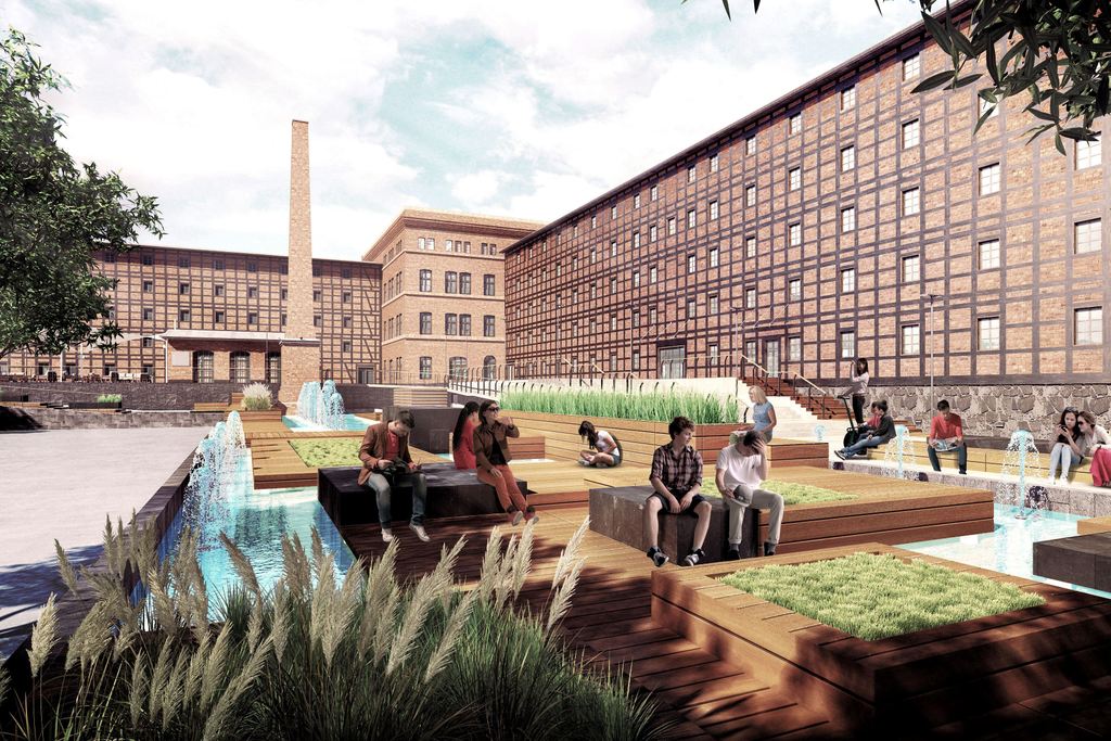 Na środku dziedzińca (przy kominie) planowana jest odbudowa pomieszczeń dawnej kotłowni (rozebrana 15 lat temu), w środku budynku ma być zlokalizowana kawiarnia i pijalnia piwa. Wzdłuż kawiarni zamontowane zostanie lekkie zadaszenie z białych żagli. Na górze nowych parterowych obiektów planowany jest taras widokowo-rekreacyjny z którego będzie widok na zielone tereny wyspy młyńskiej, fontannę (czynną w godzinach 8-22) i wejście do szaletu miejskiego (tyły amfiteatru). Wzdłuż tarasu ma popłynąć woda, będzie to nawiązywało do przeszłości obiektu. Dominantę przy tarasie stanowić ma komin, który będzie się odbijać w wodzie fontanny. Pod częścią tarasu (tam gdzie wylany jest betonowy fundament) znajdzie się parking podziemny z ogólnodostępną toaletą.